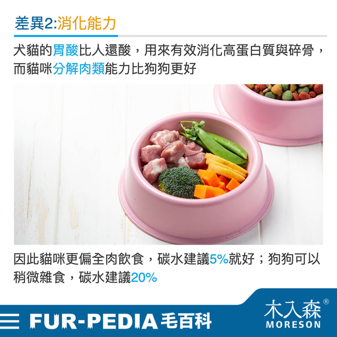 犬貓的胃酸都比人還酸,因為牠們本來的食物就是充滿高蛋白質與碎骨,較高的胃酸可以有效幫助這些食物分解。另外,貓咪的蛋白質分解酵素比狗狗的活性還高,因為貓咪屬於較嚴格的肉食性動物,比起可稍微雜食的狗狗,更需要有效分解肉類,這就是影響貓咪跟狗狗飲食需求不同的主因,狗狗通常飲食中可以有20%的碳水化合物,但貓咪盡量維持5%就好。