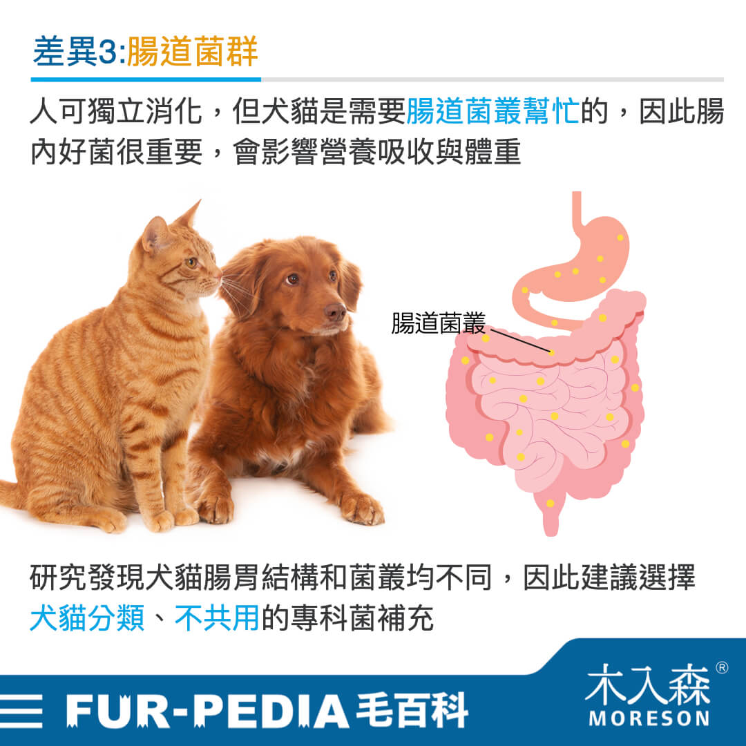狗狗和貓咪不像人類有強大及完整的消化系統,還是需要腸道菌叢幫忙分擔消化,因此腸內好菌是很重要的,會直接影響犬貓營養吸收、體重與腸胃健康。經研究發現,犬貓因為腸胃大小、長短、消化能力均不同,裡面的菌種分布也是不同的,因此除了推薦平日多幫狗狗貓咪補充益生菌外,選擇犬貓分類、不共用的專科菌補充會更適合牠們。