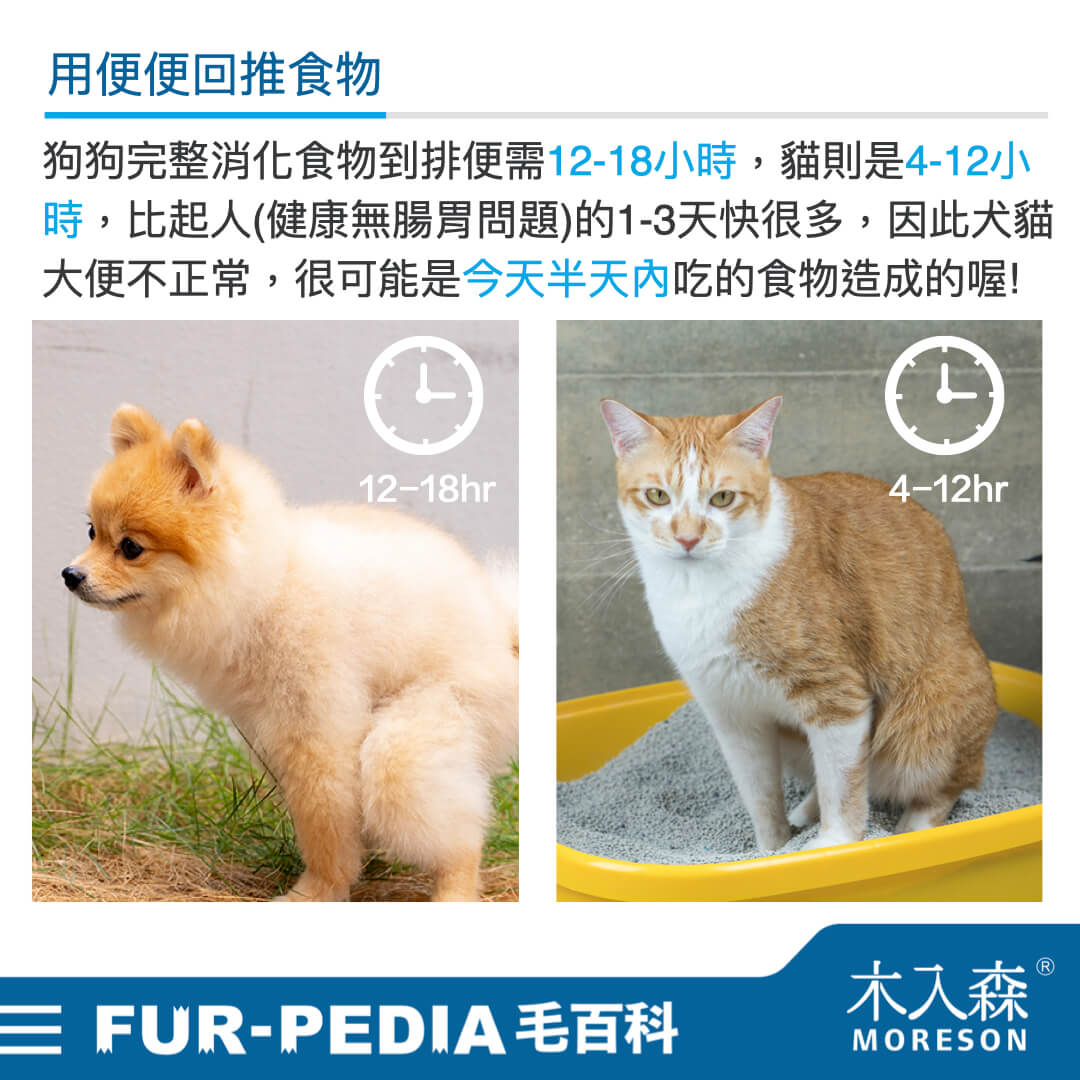 很多飼主會觀察狗狗和貓咪便便,當發現便便不正常第一個想到的一定是牠吃了什麼,那知道犬貓食物經過腸胃時間就很重要了。狗狗完整消化到排便,平均需要12小時,消化較慢的老犬可能致18小時;而貓咪更快,最短時間4小時,最慢12小時後吃的都變成「黃金」出來了。而我們人類是最緩慢的,在沒吃壞肚子的情況下,一般食物吃入要完整出來需要24小時至2-3天時間,因此判斷犬貓是吃了什麼影響排便,千萬別用我們的人的狀況去評估喲! 牠們很可能是當天或短短幾小時內影響的喲!