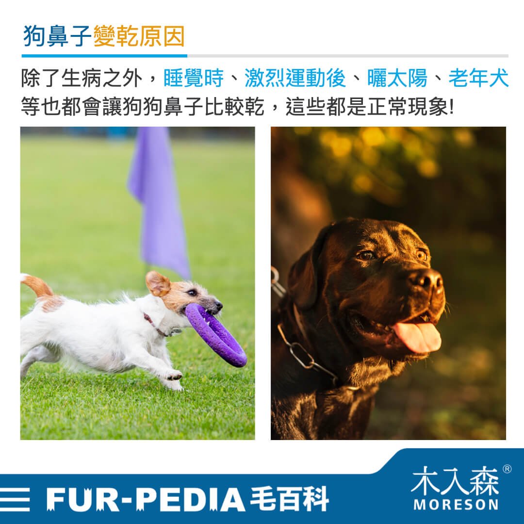 除了生病之外,睡覺時、激烈運動後、曬太陽、老年犬等也都會讓狗狗鼻子比較乾喔! 會有這些狀況,有可能是因為沒有固定舔、鼻子水分蒸散迅速或年紀影響體質使黏液分泌減少等,而讓狗狗鼻子較乾,但這卻是正常現象,狗狗不見得是生病或不舒服喔~ 參考資料[1]