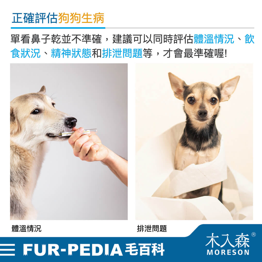 上述可知,單看狗狗鼻子乾而確定有沒有生病是不太準確的,建議將體溫情況、飲食狀況、精神狀態、排泄問題等也都納入觀察項目中呦,若發現狗狗很常鼻子乾,又明顯精神和食慾都不太好,或是一直腹瀉等,那當然是生病的機率就很高了。另外,也推薦觀察狗狗牙齦,若牙齦有發白、發灰(或試著壓牙齦,變白後血色恢復很慢)、變紫紅色、變棕色等不正常顏色變化時,也都建議趕緊將狗狗送醫喔!參考資料[2]