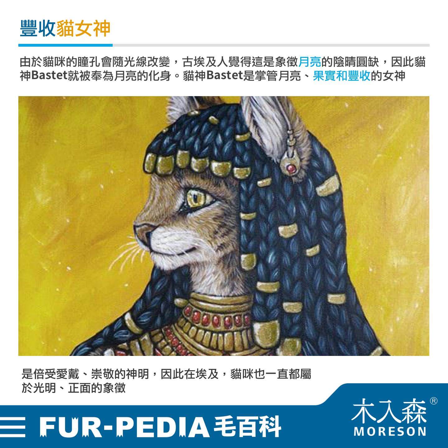 由於貓咪的瞳孔會隨光線改變,古埃及人覺得這是象徵月亮的陰晴圓缺,因此貓神Bastet就被奉為月亮的化身。貓神Bastet是掌管月亮、果實和豐收的女神,是倍受愛戴、崇敬的神明,因此在埃及,貓咪也一直都屬於光明、正面的象徵。