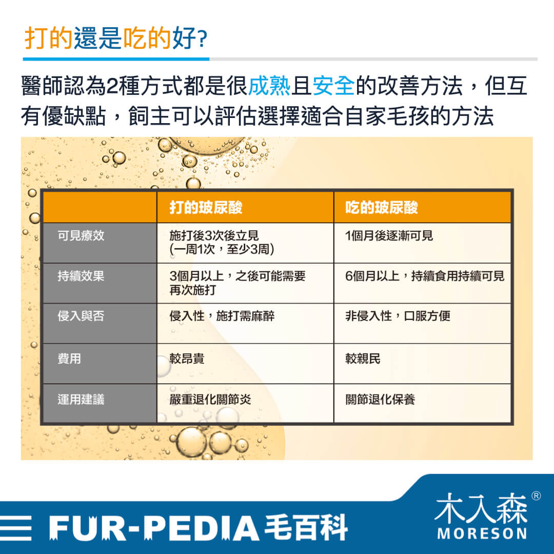 獸醫師提出,基本上打的玻尿酸多運用在關節炎治療上,因為是直接打在需求部位上,效果一定較明顯、快速,療程結束後可維持超過三個月效果,但仍需要多次施打持續三周(一周1次),且為侵入性方法需要麻醉,費用也較高昂;而食用的玻尿酸同樣證實效果明顯,但需要持續食用至少一個月以上,會較緩慢但可逐漸看到效果,為改善關節炎問題醫師建議持續食用半年以上是比較好的,但由於非侵入性且費用較低,也是一個好的選擇,飼主可以斟酌選擇適合自家的方法。