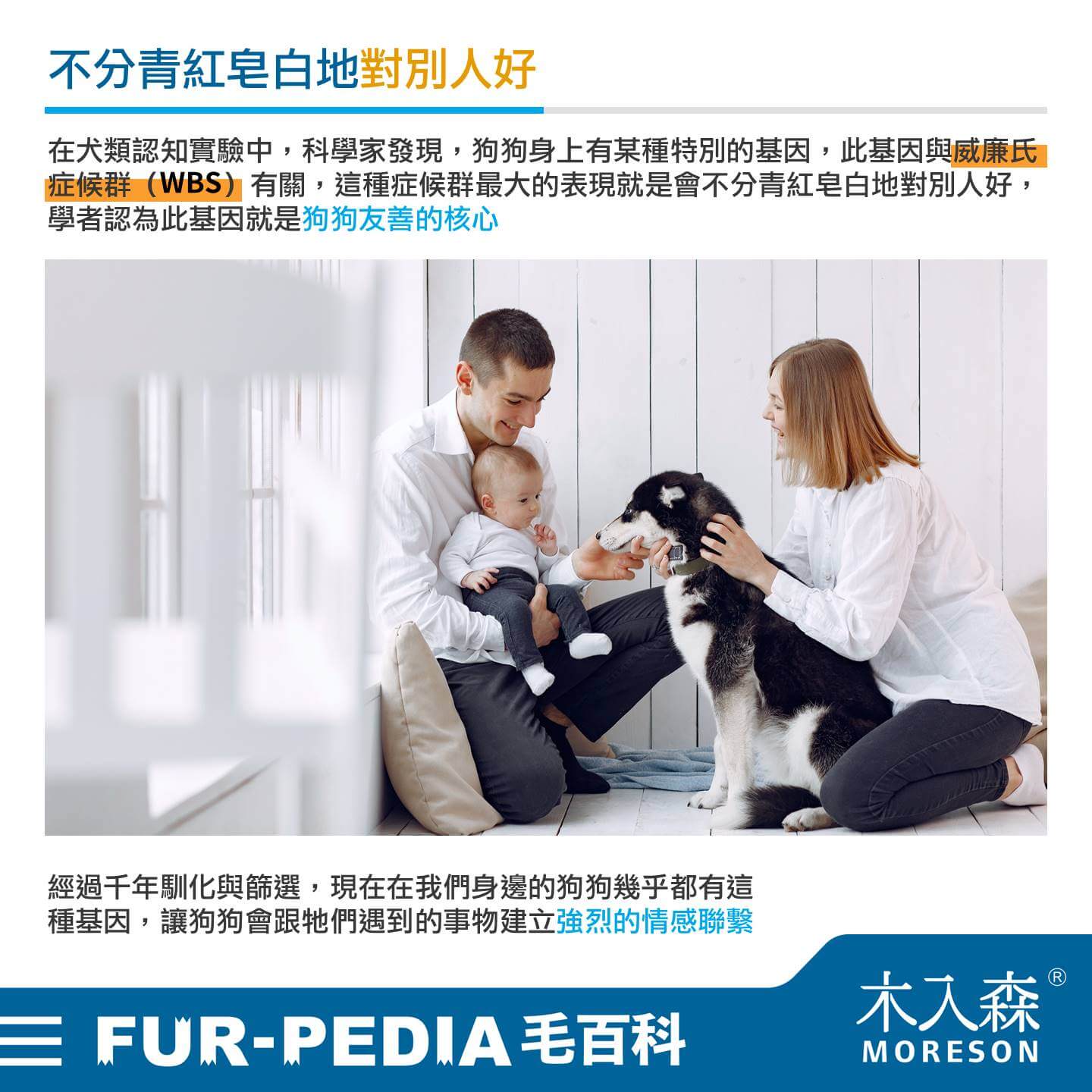 在犬類認知實驗中,科學家發現,狗狗身上有某種特別的基因,此基因與威廉氏症候群(WBS)有關,這種症候群最大的表現就是會「不分青紅皂白地對別人好」。學者認為此基因就是狗狗友善的核心,經過千年馴化與篩選,現在留在我們身邊的狗狗幾乎都有這種基因,讓狗狗會跟牠們遇到的事物建立強烈的情感聯繫,並且始終如一。