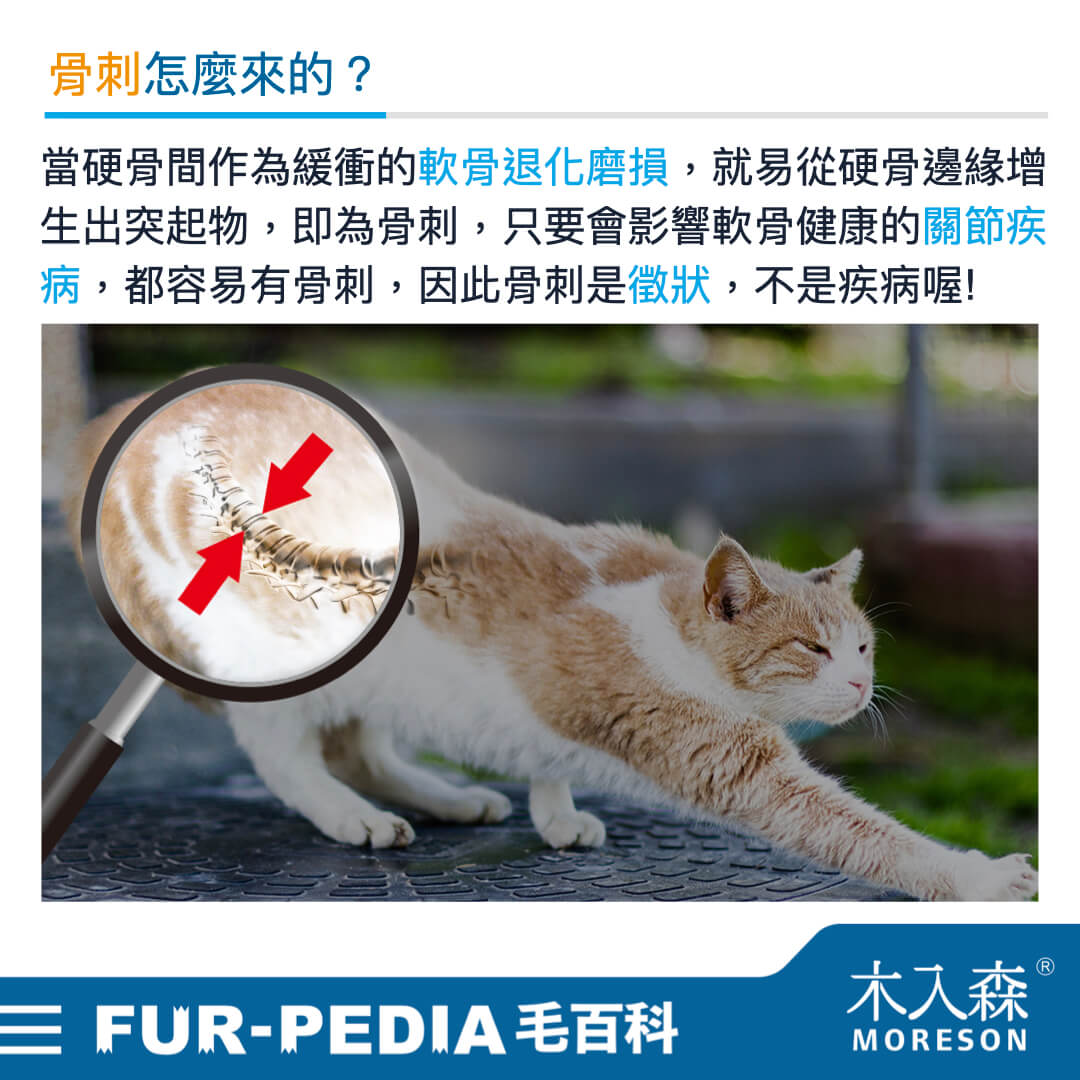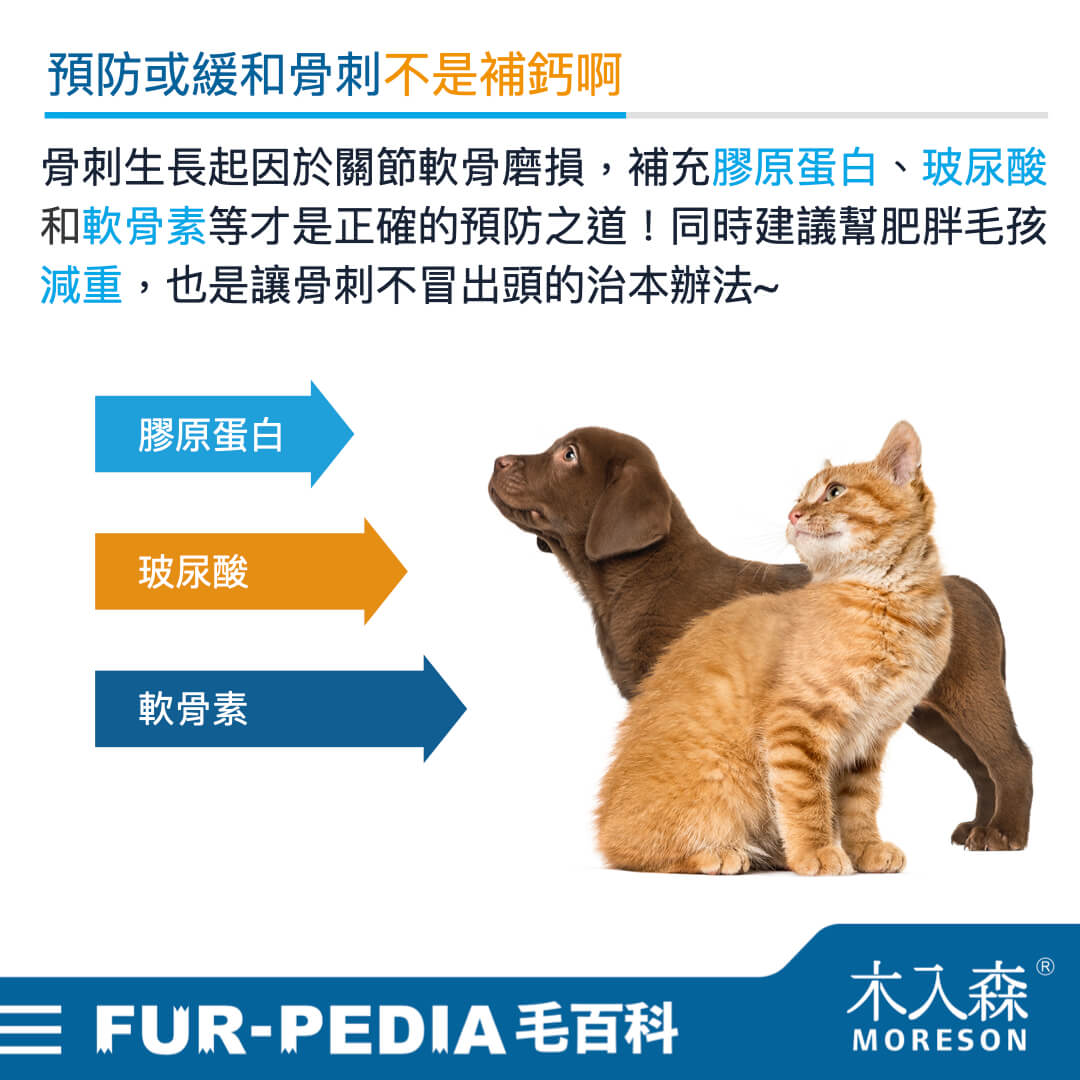想要緩和骨刺生長與疼痛必須從根源做起,因為起因是關節疾病與軟骨磨損,鈣並不是此時需求的營養喔,反而是可以幫助關節潤滑、抗發炎、延緩軟骨磨損的膠原蛋白、玻尿酸、軟骨素、維他命C、魚油和薑黃等是更推薦這時候補充的,也建議若毛還有過重必須好好減肥降低關節、脊椎的負擔呦!