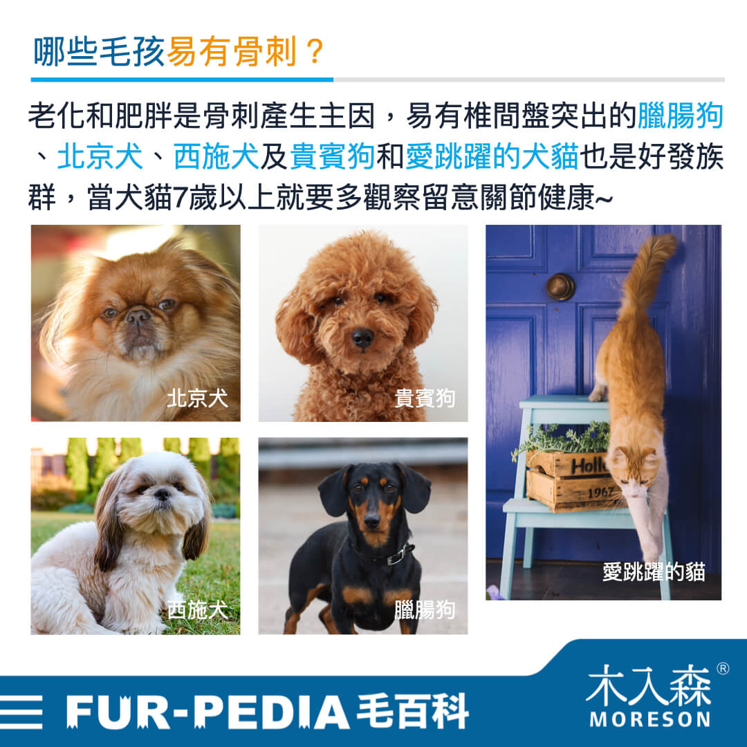 骨刺最容易發生於犬貓的四肢關節與脊椎兩側,老化產生的關節退化與過度肥胖壓迫磨損關節是骨刺產生的最主要2大因素,因此其實大多毛孩都有可能面臨骨刺問題,雖然骨刺產生很緩慢也未必會造成疼痛,但當骨刺壓迫到神經時,那種蝕骨的痛還是會對犬貓負擔很大的,因此還是需要飼主的重視! 尤其容易有椎間盤突出的臘腸狗、北京犬、西施犬及貴賓狗等犬種,和特別活潑愛跳躍的犬貓,都是骨刺易好發的族群,當牠們7歲後需要固定觀察、留意關節和骨刺問題喔!