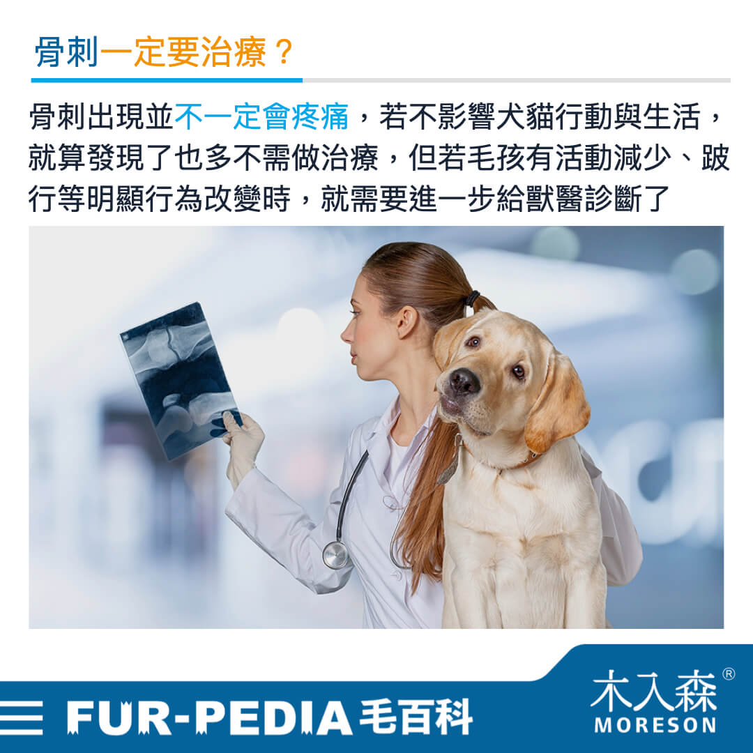 骨刺出現並不一定就會造成病症或疼痛,若不影響犬貓行動與生活,就算發現了大部分也不需做治療,但當發現犬貓開始四肢僵硬、活動量減少、跛行、起身困難和不愛跳高等,就有可能是骨刺所造成的疼痛導致,此時獸醫師會給予止痛藥,並根據骨刺的嚴重程度考慮手術去除,或是使用針灸對骨刺治療也有一定幫助。