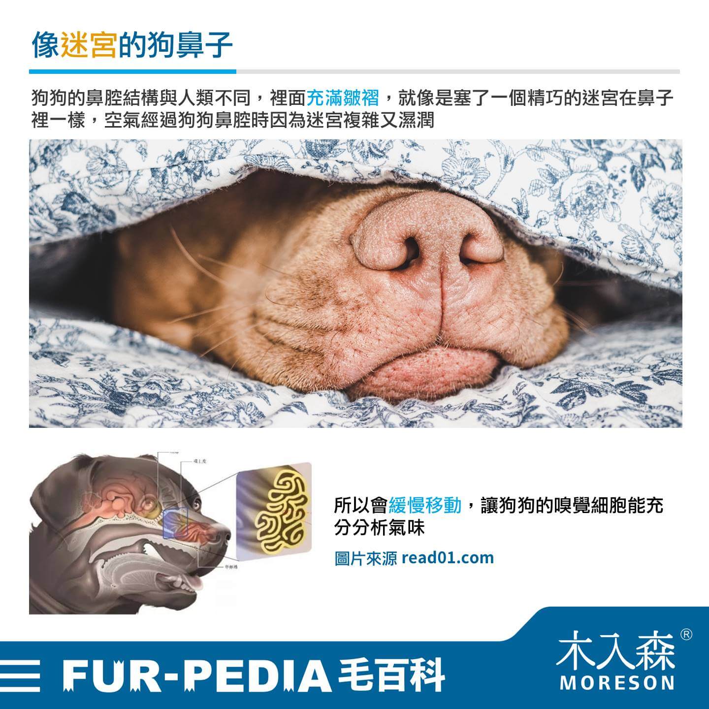 狗狗的鼻腔結構與人類不同,裡面充滿皺褶,就像是塞了一個精巧的迷宮在鼻子裡一樣,空氣經過狗狗鼻腔時因為迷宮複雜又濕潤,所以會緩慢移動,讓狗狗的嗅覺細胞能充分分析氣味。