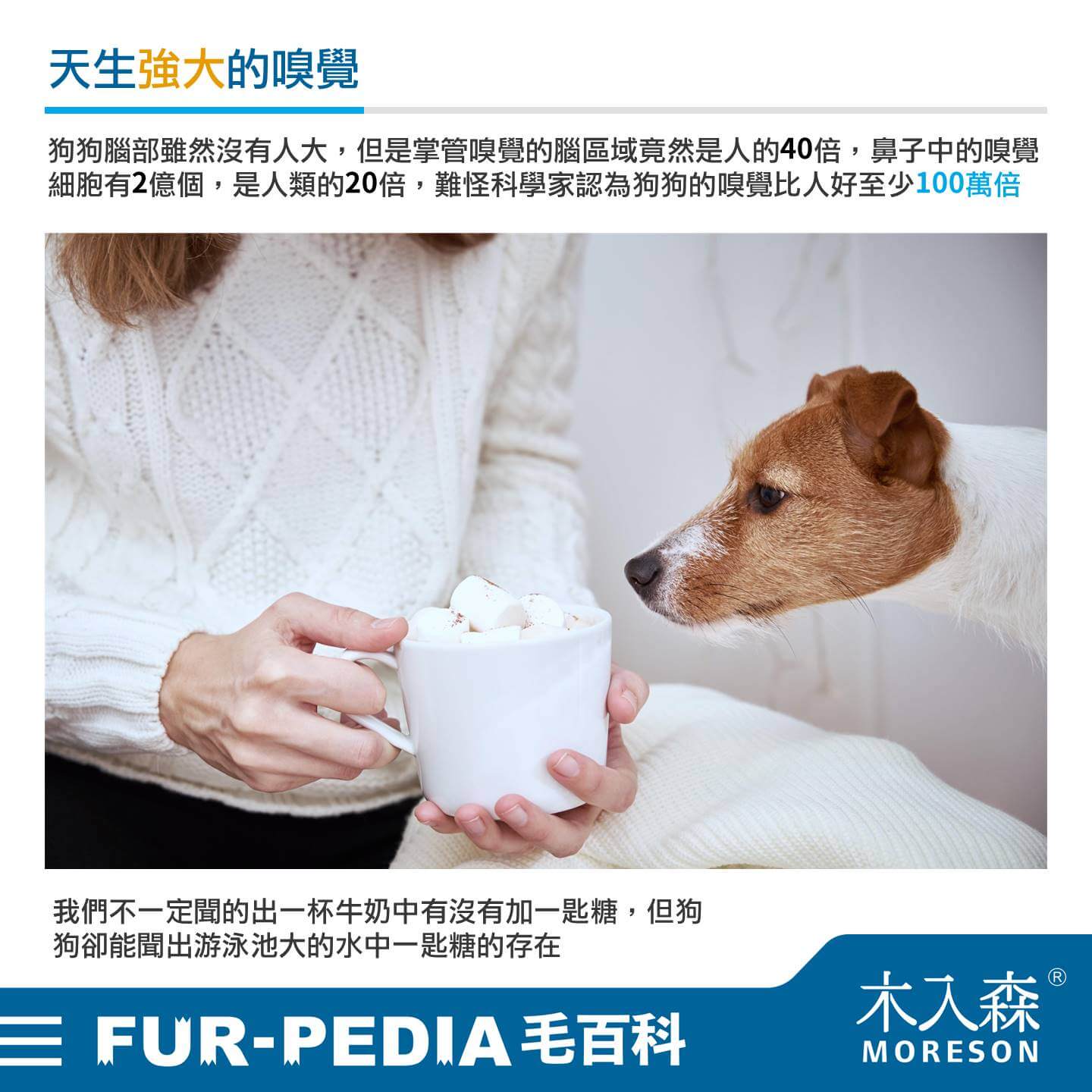 狗狗腦部雖然沒有人大,但是掌管嗅覺的腦區域竟然是人的40倍,鼻子中的嗅覺細胞有2億個,是人類的20倍,難怪科學家們認為狗狗的嗅覺比人好至少100萬倍。我們不一定聞的出一杯牛奶中有沒有加一匙糖,但狗狗卻能聞出游泳池大的水中一匙糖的存在。