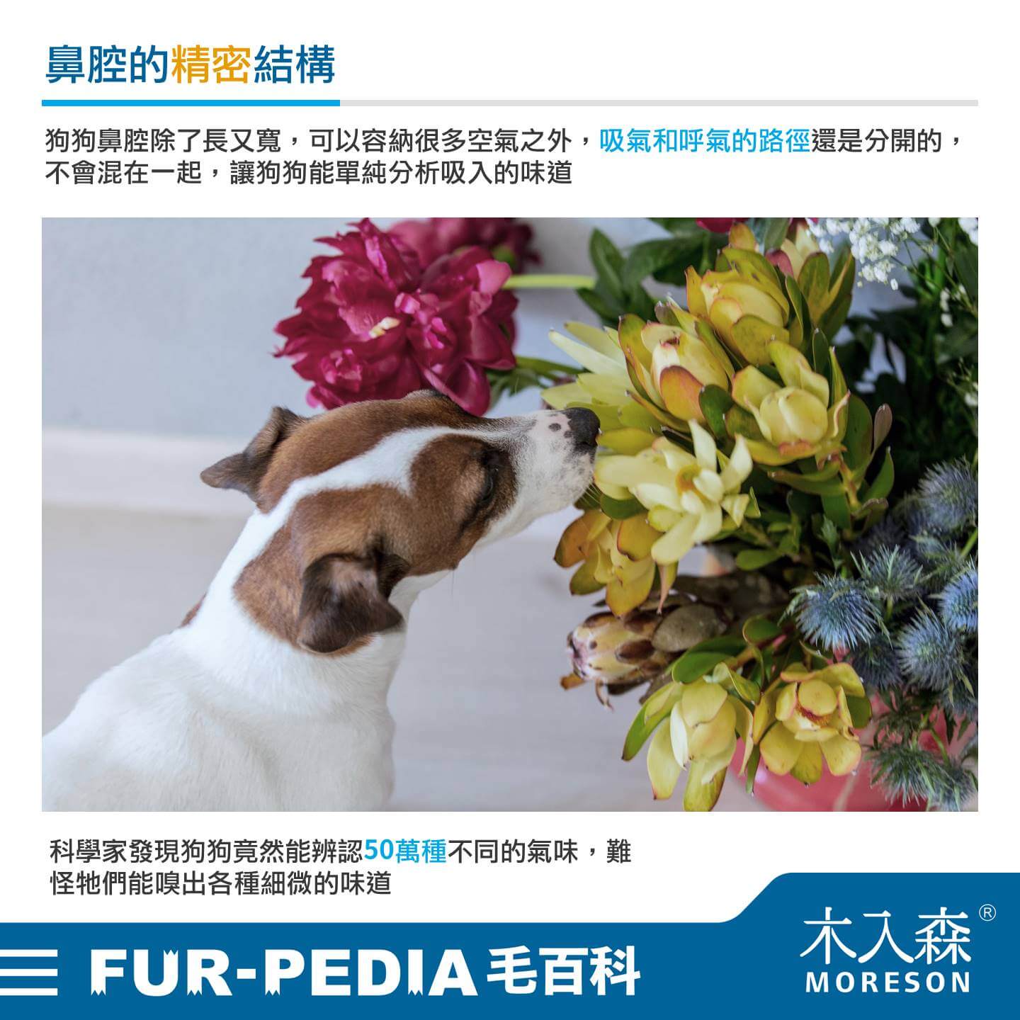 狗狗鼻腔除了長又寬,可以容納很多空氣之外,吸氣和呼氣的路徑還是分開的,不會混在一起,讓狗狗能單純分析吸入的味道。科學家發現狗狗竟然能辨認50萬種不同的氣味,難怪牠們能嗅出各種細微的味道。