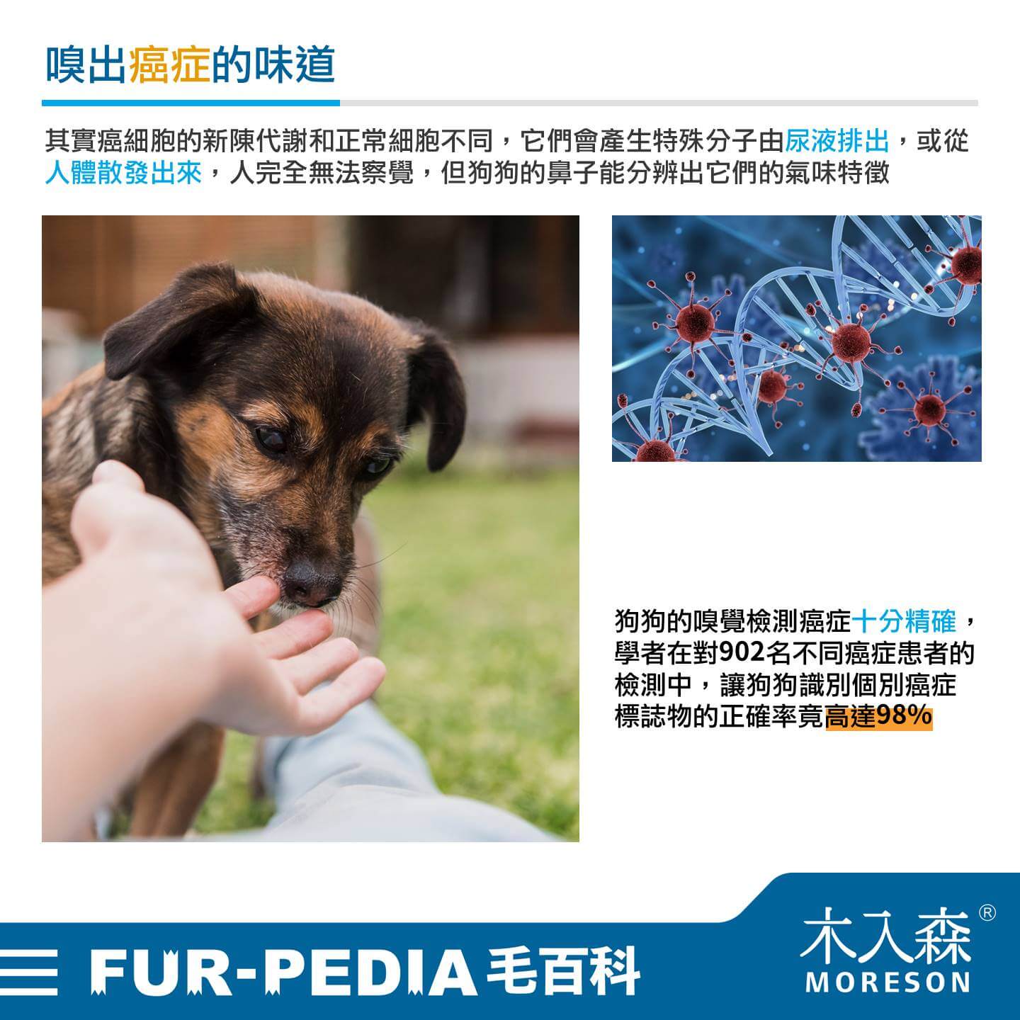 其實癌細胞的新陳代謝和正常細胞不同,它們會產生特殊分子由尿液排出,或從人體散發出來,人完全無法察覺,但狗狗的鼻子能分辨出它們的氣味特徵。狗狗的嗅覺檢測癌症十分精確,學者在對902名不同癌症患者的檢測中,讓狗狗識別個別癌症標誌物的正確率竟高達98%。