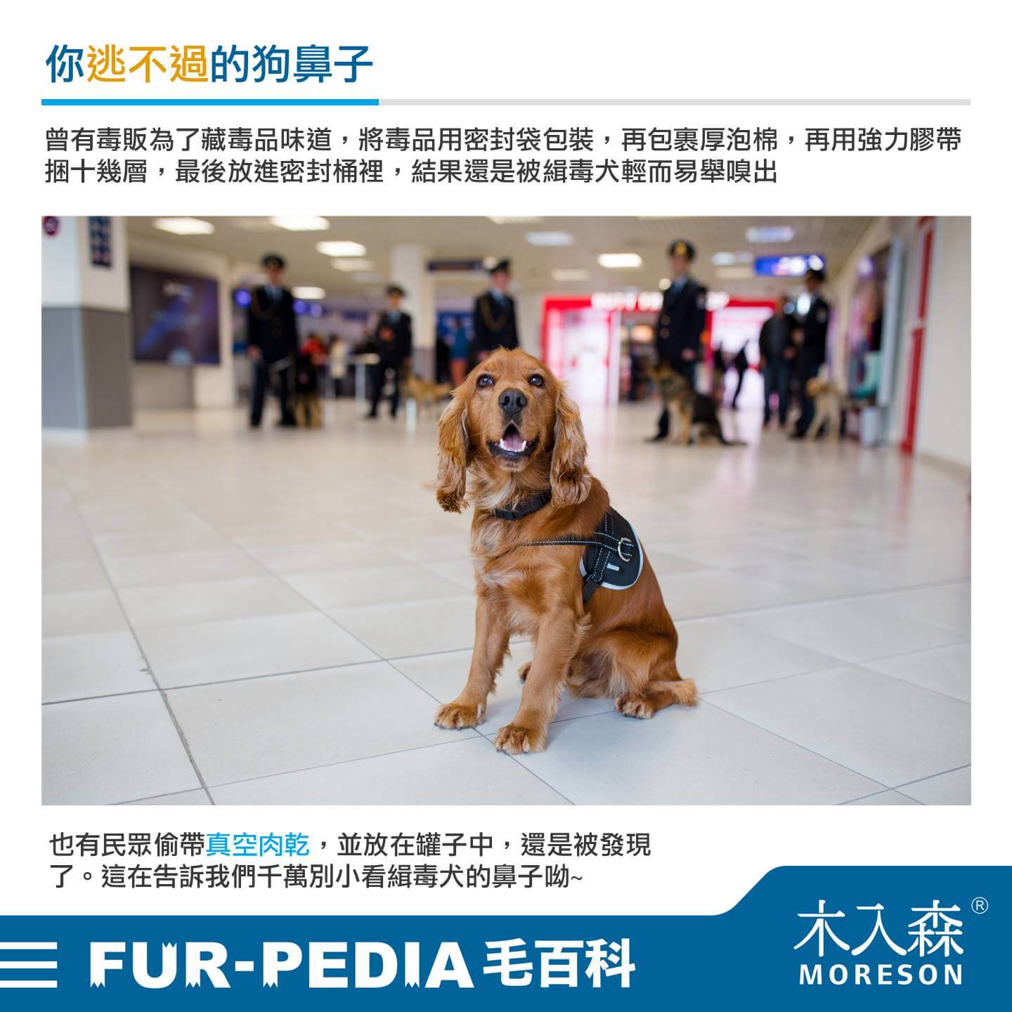 曾有毒販為了藏毒品味道,將毒品用密封袋包裝,再包裹厚泡棉,再用強力膠帶捆十幾層,最後放進密封桶裡,結果還是被緝毒犬輕而易舉嗅出。也有民眾僥倖偷帶真空肉乾,並用報紙包裹放在罐子中,還是被狗狗發現了。這都在告訴我們千萬別小看狗狗鼻子,別抱持僥倖心態呦~