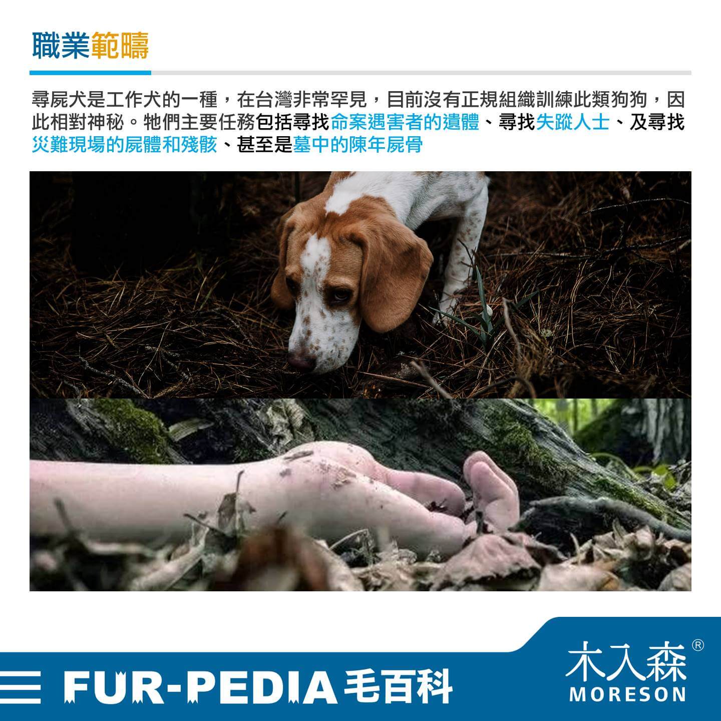尋屍犬是工作犬的一種,在台灣非常罕見,目前沒有正規組織訓練此類狗狗,因此相對神秘,牠們主要任務包括尋找命案遇害者的遺體、尋找失蹤人士以及尋找災難現場的屍體和殘骸,甚至是墓中的陳年屍骨。
