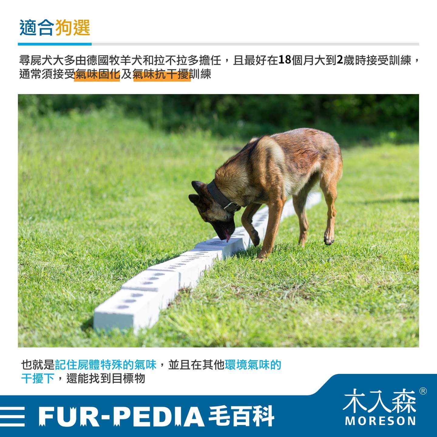 尋屍犬大多由德國牧羊犬和拉不拉多擔任,且最好在18個月大到2歲時接受訓練,通常須接受氣味固化及氣味抗干擾訓練,也就是記住屍體特殊的氣味,並且在其他環境氣味的干擾下,還能找到目標物。