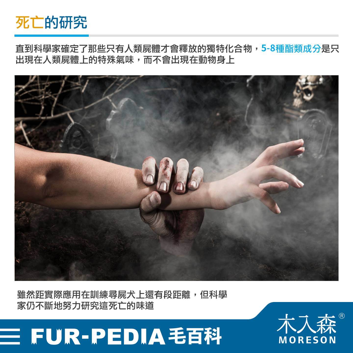 目前,科學家確定了那些只有人類屍體才會釋放的獨特化合物,5-8種酯類成分是只出現在人類屍體上的特殊氣味,而不會出現在動物身上。雖然距實際應用在訓練尋屍犬上還有段距離,但科學家仍不斷地努力研究這死亡的味道。