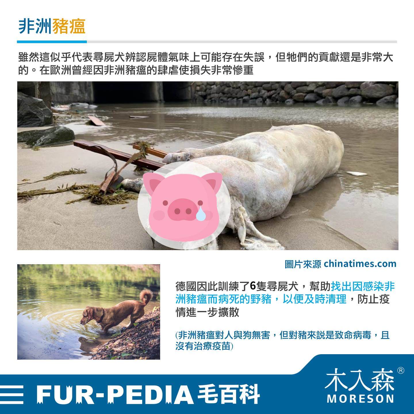 雖然這似乎代表尋屍犬辨認屍體氣味上可能存在失誤,但牠們的貢獻還是非常大的。在歐洲曾經因非洲豬瘟的肆虐使損失非常慘重,德國因此訓練了6隻尋屍犬,幫助找出因感染非洲豬瘟而病死的野豬,以便及時清理,防止疫情進一步擴散。