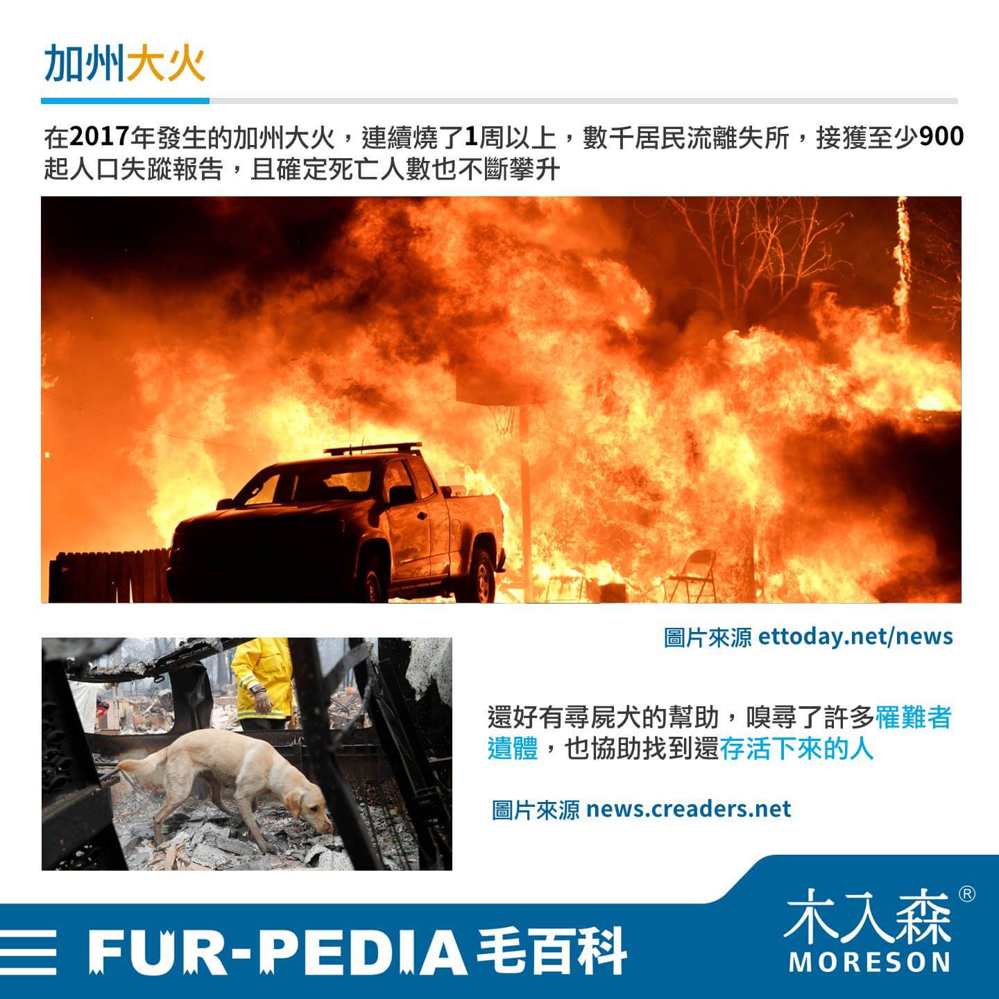 在2017年發生的加州大火,連續燒了1周以上,數千居民流離失所,接獲至少900起人口失蹤報告,且確定死亡人數也不斷攀升,還好有尋屍犬的幫助,嗅尋了許多罹難者遺體,也協助找到還存活下來的人。