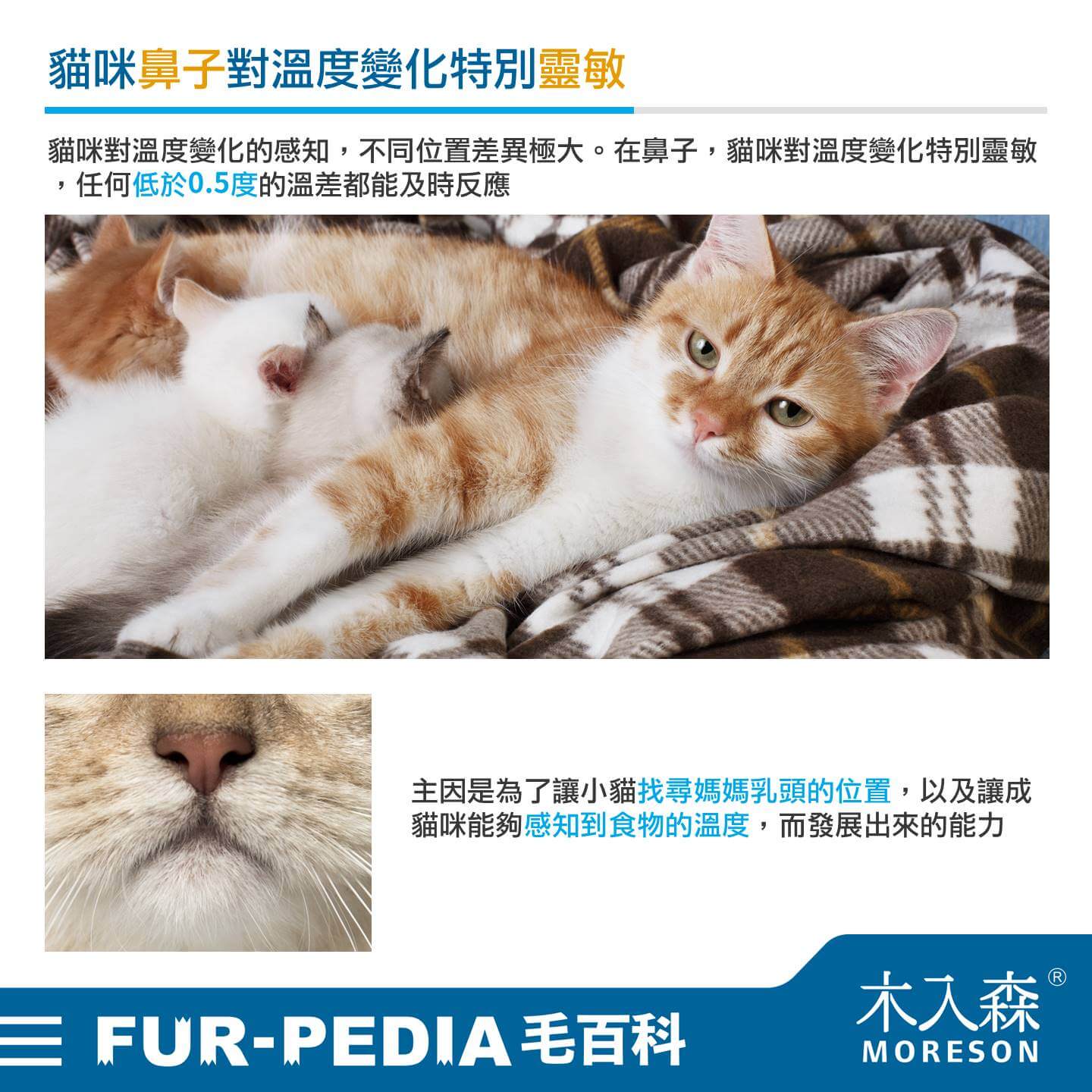 貓咪對溫度變化的感知,不同位置差異極大。在鼻子,貓咪對溫度變化特別靈敏,任何低於0.5度的溫差都能及時反應,主因是為了讓小貓找尋媽媽乳頭的位置,以及讓成貓咪能夠感知到食物的溫度,而發展出來的能力。