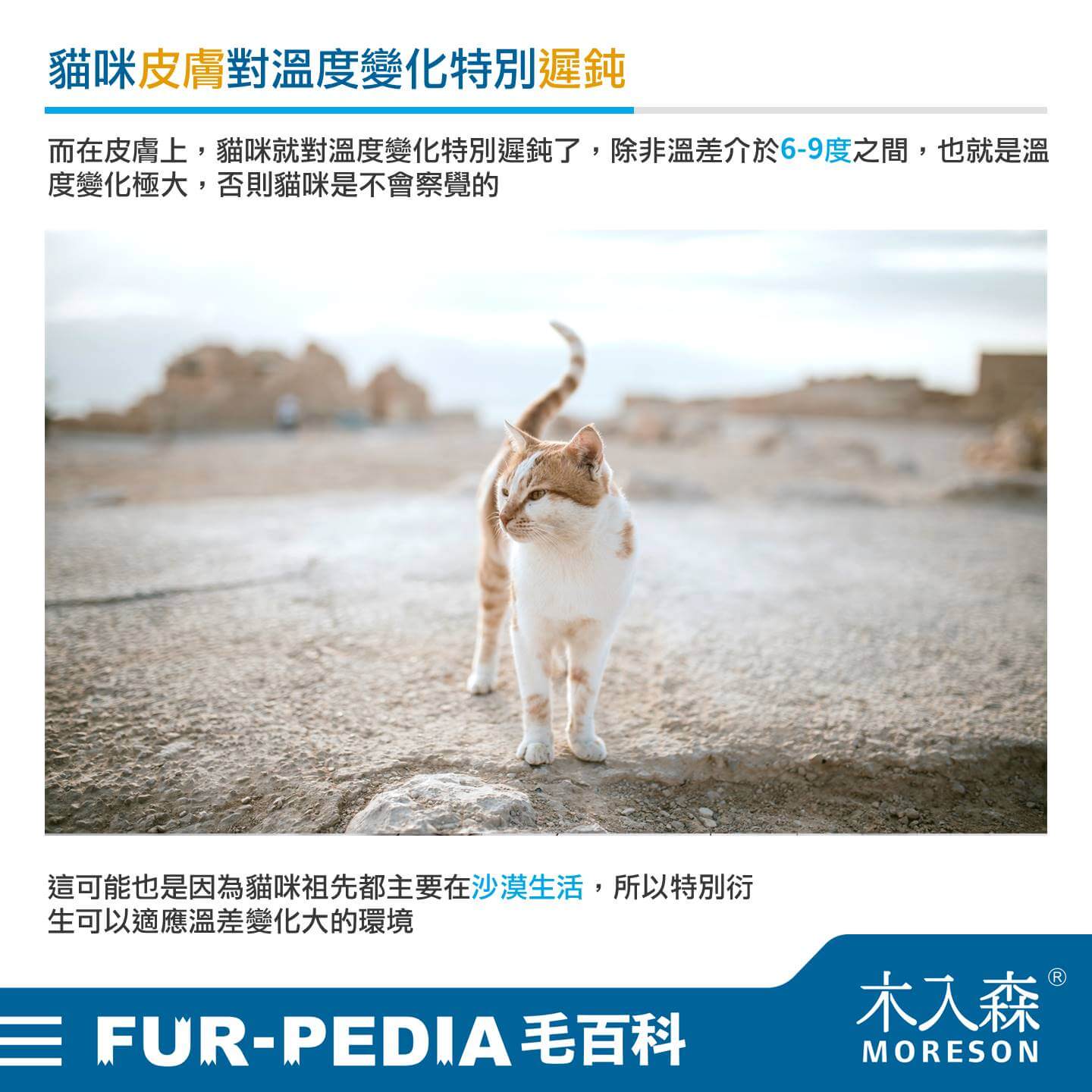 而在皮膚上,貓咪就對溫度變化特別遲鈍了,除非溫差介於6-9度之間,也就是溫度變化極大,否則貓咪是不會察覺的,這可能也是因為貓咪祖先都主要在沙漠生活,所以特別衍生可以適應溫差變化大的環境。