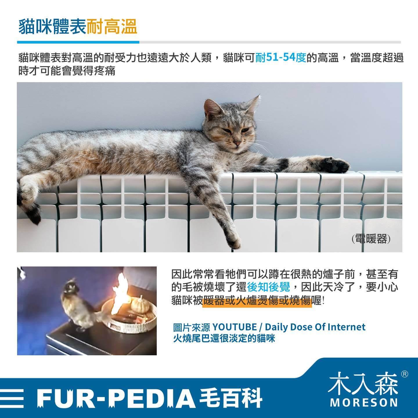 貓咪體表對高溫的耐受力也遠遠大於人類,貓咪可耐51-54度的高溫,當溫度超過時才可能會覺得疼痛,因此常常看牠們可以蹲在很熱的爐子前,甚至有的毛被燒壞了還後知後覺,因此天冷了,要小心貓咪被暖器或火爐燙傷或燒傷喔!