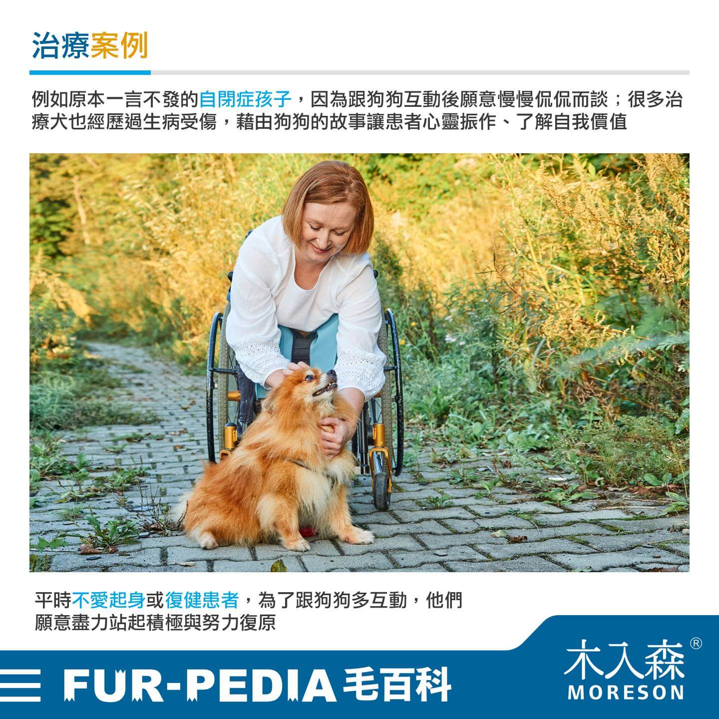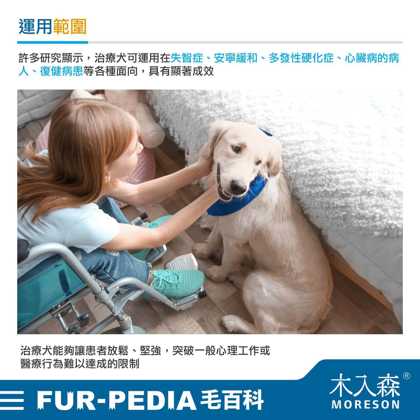 許多研究顯示,治療犬可運用在失智症、安寧緩和、多發性硬化症、心臟病的病人、復健病患等各種面向,具有顯著成效。治療犬能夠讓患者放鬆、堅強,突破一般心理工作或醫療行為難以達成的限制。