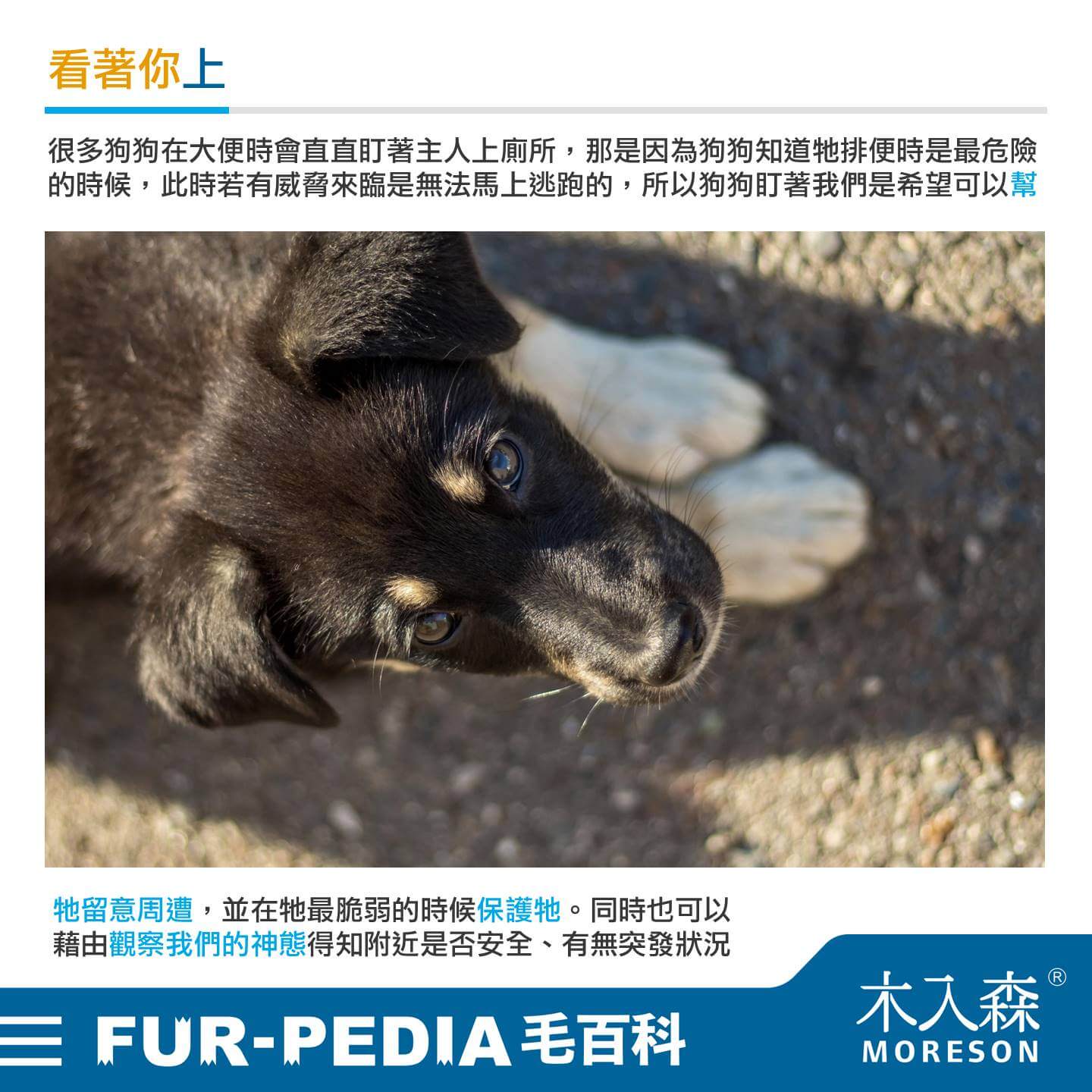 很多狗狗在大便時會直直盯著主人上廁所,那是因為狗狗知道牠排便時是最危險的時候,此時若有威脅來臨是無法馬上逃跑的,所以狗狗盯著我們是希望可以幫牠留意周遭,並在牠最脆弱的時候保護牠。同時也可以藉由觀察我們的神態得知附近是否安全、有無突發狀況等