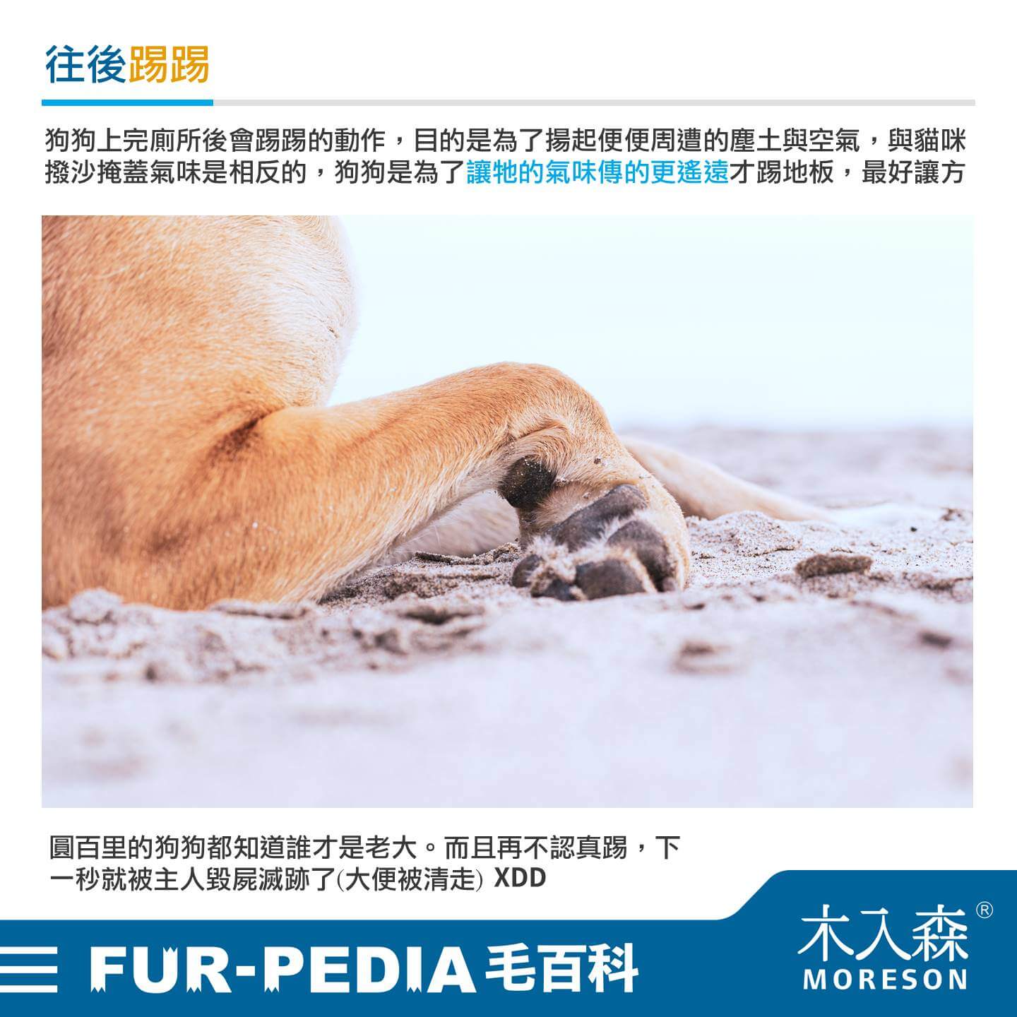 狗狗上完廁所後會踢踢的動作,目的是為了揚起便便周遭的塵土與空氣,與貓咪撥沙掩蓋氣味是相反的,狗狗是為了讓牠的氣味傳的更遙遠才踢地板,最好讓方圓百里的狗狗都知道誰才是老大。而且再不認真踢,下一秒就被主人毀屍滅跡了(大便被清走)XDD