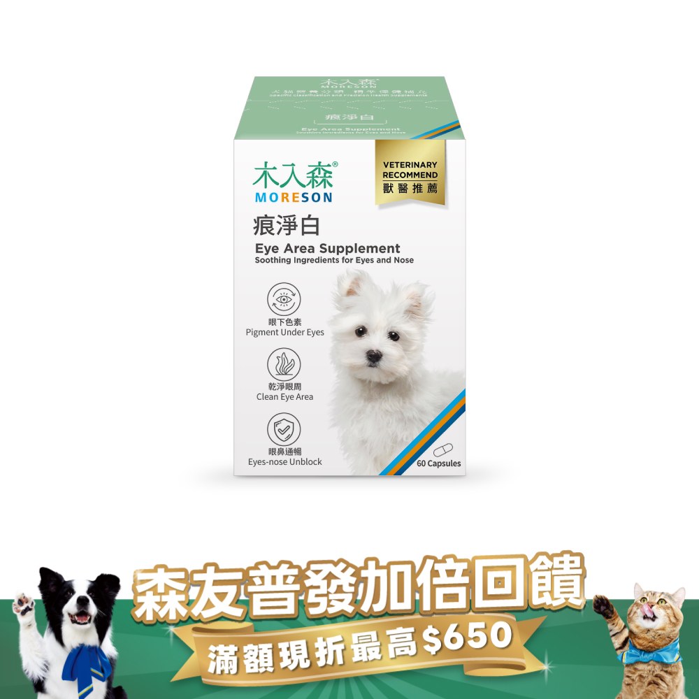 木入森 犬寶痕淨白,全面 4 大淨白營養,針對多重流淚原因,顧及眼睛、鼻子、免疫、菌源 4 重守護,具備強效抗氧化力,管理眼污累積,幫助呼吸順暢並針對敏感提供護理。成分據研究證實,可管理色素累積,達到淨白效果。