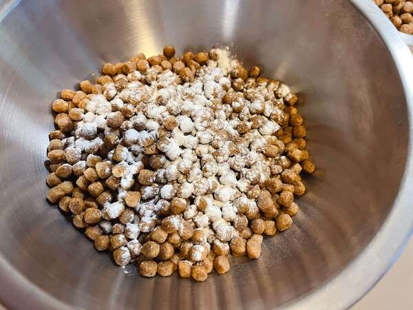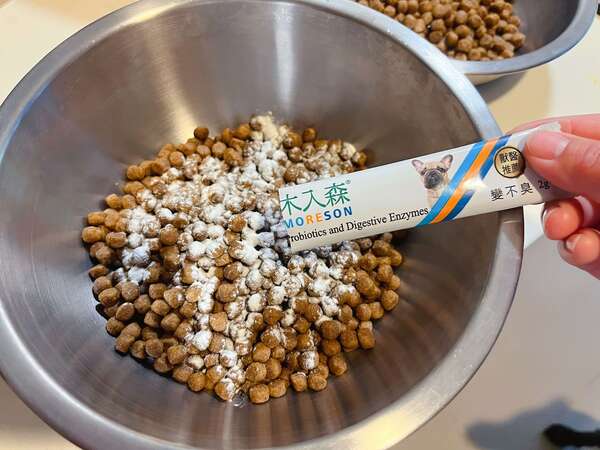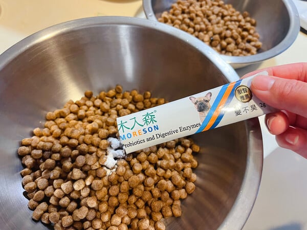 木入森 MORESON 犬變不臭2.0升級版不管是搭配飼料或溶入水中飲用都可以。如果是搭配鮮食的話,建議一定要等食物完全變涼才加入,不然熱度會破壞益生菌的組織喔。這款益生菌是白色的粉末狀,Garry 會在灑在飼料上後稍微搖晃一下盤子,讓益生菌能更充分的散開來。